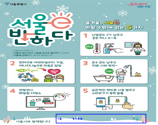 ¡®¼¿ïe ¹ÝÇÏ´Ù¡¯´Â ¼¿ï½Ã¿Í ¼¿ï½Ã±³À°Ã», ³ì»ö¼¿ï½Ã¹ÎÀ§¿øÈ¸°¡ ÃßÁøÇÏ´Â °Ü¿ïö ¿¡³ÊÁö Àý¾à Ä·ÆäÀÎÀ¸·Î ¡ã ³¹æ ¿Âµµ 2¡É ³·Ãß°í °Ñ¿Ê Çϳª ¾²-À¹ ¡ã §Å×Å©·Î ¿¡ÄÚ¸¶Àϸ®Áö °¡ÀÔ, ¿¡³ÊÁö ³ª´®À¸·Î ¸¶À½Àº ´Þ´Þ ¡ã ¿Â¼ö ¿Âµµ ³·Ãß°í 10ºÐ »þ¿ö ¶Òµü! ¡ã ¿¬¸»¿¬½Ã ¸ÞÀÏÇÔ(ÀüÀÚ¿ìÆíÇÔ) ´ëû¼Ò ¡ã ½À°üÀûÀÎ ÇÚµåÆù »ç¿ë ¸ØÃß°í ½º¸¶Æ®±â±â Áßµ¶ Å»ÃâÇÏ±â µî ´Ù¼¸ °¡Áö ½Çõ ¼öÄ¢ÀÌ ÀÖ´Ù.