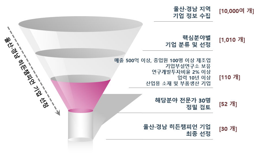 ÀÌµé ¡®È÷µçèÇǾð±â¾÷¡¯ÀÇ ¼±Á¤ °úÁ¤À» º¸¸é ¿ì¼± ¨ç ¿ï»ê¡¤°æ³² Áö¿ª ³» 10,000¿© °³ÀÇ Èĺ¸ ±â¾÷µé Áß¿¡¼ ¨è ÇÙ½É ºÐ¾ßº° »ê¾÷¿ë ¼ÒÀç ¹× ºÎǰ Á¦Á¶±â¾÷µé 1,000¿© °³¸¦ ºÐ·ù ¹× ¼±º°Çϰí, ¨é À̵é Áß¿¡¼ ¸ÅÃâ 500¾ï ÀÌ»ó, Á¾¾÷¿ø 100¸í ÀÌ»ó, ±â¾÷ºÎ¼³¿¬±¸¼Ò º¸À¯, ¿¬±¸°³¹ßÅõÀÚºñÀ² 2% ÀÌ»ó°ú ¾÷·Â µî ¿©·¯ Á¶°ÇÀ» °¨¾ÈÇÏ¿© 110°³ ±â¾÷À» ¼±º°ÇÑ ´ÙÀ½, ¨ê ´Ù½Ã À̵éÀ» ÇØ´ç ºÐ¾ß Àü¹®°¡ À§¿øÈ¸(30¸í)¿¡ °ËÅä ¹× ÀÚ¹® ÀÇ·ÚÇÏ¿© ÃÖÁ¾ °áÁ¤ÇÏ¿´´Ù.