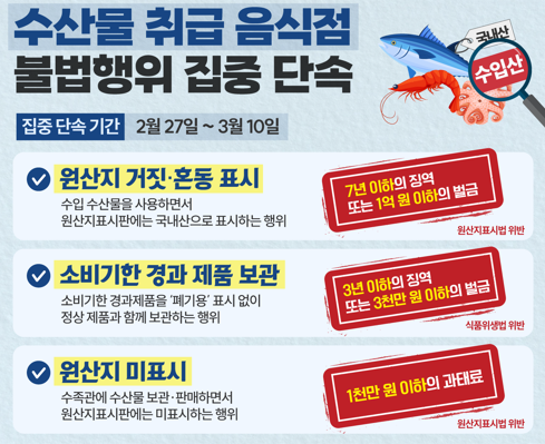 °æ±âµµ ¹Î»ýƯº°»ç¹ý°æÂû´ÜÀÌ 2¿ù 27ÀϺÎÅÍ 3¿ù 10ÀϱîÁö µµ³» ¼öÀÔ ¼ö»ê¹° Ãë±Þ À½½ÄÁ¡ 360°³¼Ò¸¦ ÁýÁß ´Ü¼ÓÇÑ´Ù.