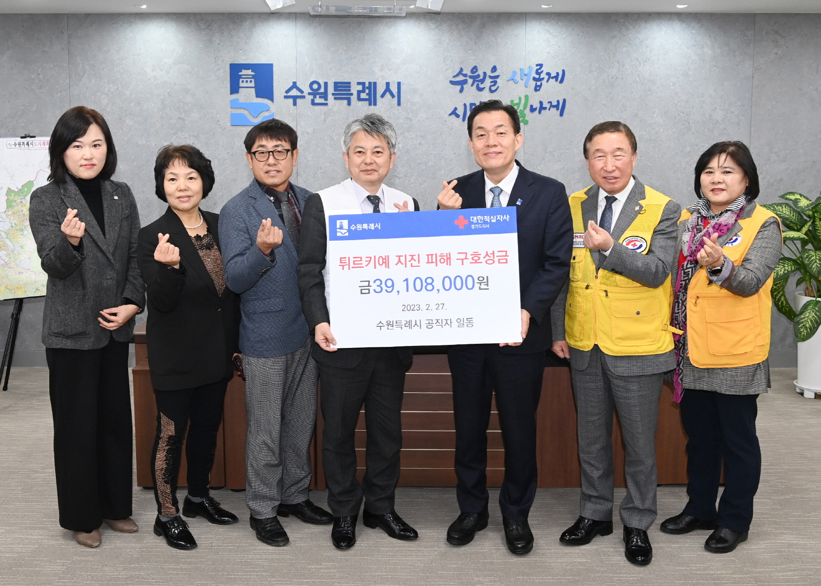 ¼ö¿ø½Ã °øÁ÷ÀÚ, Çù¾÷±â°ü Á÷¿øµéÀÌ Æ¢¸£Å°¿¹¡¤½Ã¸®¾Æ ÁöÁøÇÇÇØ ±¸È£±Ý 3910¸¸ ¿øÀ» ¸ð±ÝÇØ ´ëÇÑÀû½ÊÀÚ»ç °æ±âÁö»ç¿¡ Àü´ÞÇß´Ù.