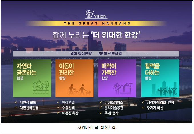 ÇѰÀÇ ÀÚ¿¬»ýŸ¦ Á¸ÁßÇϸ鼵µ ÇѰÀÇ ÆíÀǼº, ¸Å·ÂÀ» ³ô¿© ½Ã¹Î »îÀÇ ÁúÀ» ³ôÀ̰í, ¼öº¯ÀÇ È°·ÂÀ» ÇѰÀÇ µµ½Ã°ø°£±îÁö È®ÀåÇÏ¿© ¼¿ïÀÇ µµ½Ã°æÀï·ÂÀ» °ÈÇϰڴٴ °èȹÀÌ´Ù.