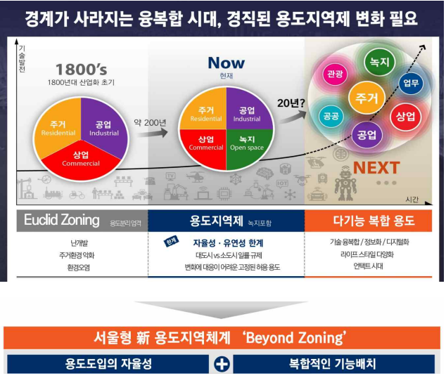 ¼¿ï½Ã°¡ »õ·Î¿î µµ½Ã°èȹ ü°èÀÎ ¡®ºñ¿æµå Á¶´×(Beyond Zoning)¡¯ÀÇ ½ÇÇöÀ» À§ÇØ ÀÌ´Þ °ü·Ã ¿ë¿ªÀ» Âø¼öÇÑ´Ù´Â °èȹÀ» ¹àÇû´Ù. À̸¦ ÅëÇØ À¯¿¬ÇÑ µµ½Ã°èȹÀ¸·ÎÀÇ ÀüȯÀ» ¸ñÇ¥·Î, ¿ëµµ µµÀÔÀÇ ÀÚÀ²¼ºÀ» ³ô¿© ´Ù¾çÇÑ ±â´ÉÀÌ È¥ÇÕµÈ ¹Ì·¡°ø°£À» âÃâÇÏ°Ú´Ü ¹æÄ§ÀÌ´Ù.