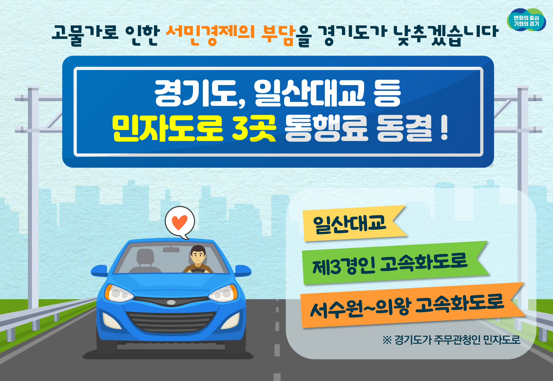 °æ±âµµ´Â Áö³ÇØ¿¡ ÀÌ¾î ¿ÃÇØ 2³â ¿¬¼Ó µµ¿¡¼ °ü¸®ÇÏ´Â ¡®ÀÏ»ê´ë±³¡¯, ¡®Á¦3°æÀÎ °í¼Óȵµ·Î¡¯, ¡®¼¼ö¿ø~ÀÇ¿Õ °í¼Óȵµ·Î¡¯ µî ¹ÎÀÚµµ·Î 3°÷ÀÇ ÅëÇà·á¸¦ µ¿°áÇÑ´Ù°í 31ÀÏ ¹àÇû´Ù. Áö³ 2¿ù ¹ö½º¿ä±Ý ÀÌÈÄ µÎ ¹øÂ° °ø°ø¹°°¡ ÀÎ»ó µ¿°á Á¶Ä¡´Ù.