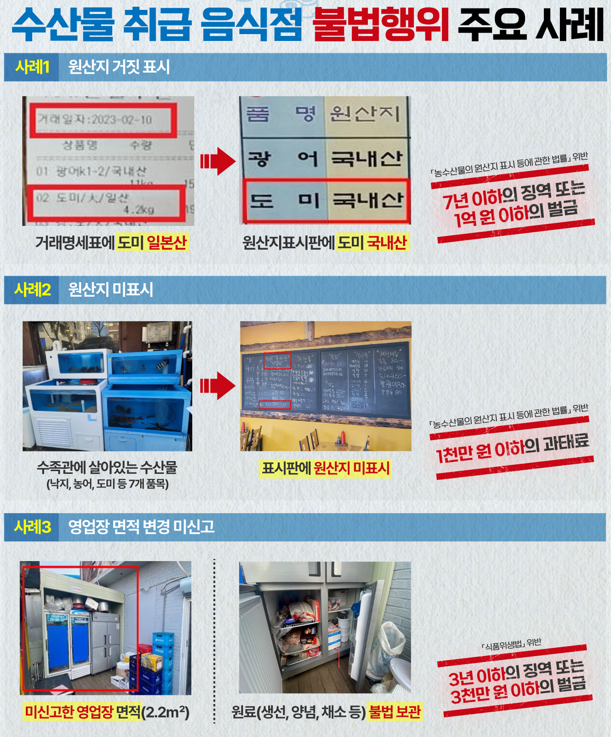 ±¹³»»êÀ¸·Î Ç¥½ÃÇÏ°í ¿Ü±¹»ê ¼ö»ê¹°À» »ç¿ëÇÏ´Â µî °ü·Ã ¹ý·ÉÀ» À§¹ÝÇÑ ¼ö»ê¹° Ãë±Þ À½½ÄÁ¡ 55°³¼Ò°¡ °æ±âµµ ¹Î»ýƯº°»ç¹ý°æÂû´Ü¿¡ Àû¹ßµÆ´Ù.