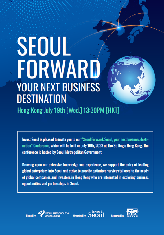 ¼¿ï ÅõÀÚÀ¯Ä¡ Àü´ã±â±¸ÀÎ ¡®Àκ£½ºÆ®¼¿ï(Invest Seoul)¡¯ Àº È«ÄáÀÇ ´ëÇ¥ÀûÀÎ ¹«¿ª․ÅõÀÚ ÃËÁø±â°üÀÎ ¡®È«Äṫ¿ª¹ßÀü±¹(HKTDC)¡¯°ú ¼ÕÀâ°í, ¼¿ï¿¡ ÁøÃâÀ» ¿øÇÏ´Â ±â¾÷µéÀ» ´ë»óÀ¸·Î ¼¿ï Æ÷¿öµå(Seoul Forward-Your Next Business Destination)¡¯¸¦ 7¿ù 19ÀÏ(¼ö) È«Äá(St. Regis È£ÅÚ)¿¡¼ °³ÃÖÇß´Ù.