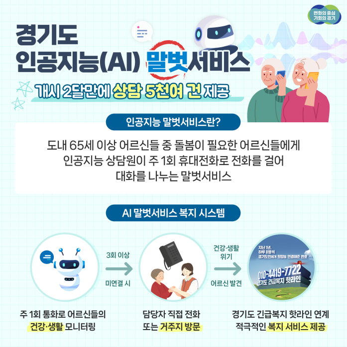 ³ëÀθ»¹þ¼ºñ½º´Â ´ë±Ô¸ð ¾ð¾î ¸ðµ¨(LLM)À» Ȱ¿ëÇÑ »ý¼ºÇü ÀΰøÁö´ÉÀ» µµÁ¤¿¡ Á¢¸ñÇÑ °ÍÀÌ´Ù. °æ±âµµ´Â Æ÷ÅÐ»ç ³×À̹ö¿Í Á¦ÈÞ¸¦ ¸Î¾î ÀΰøÁö´É »ó´ã¿øÀÌ ÁÖ 1ȸ ¼ºñ½º ´ë»ó ³ëÀÎÀÇ ÈÞ´ëÀüÈ·Î Àüȸ¦ °É¾î ÀÚ¿¬½º·¯¿î ´ëȸ¦ ³ª´©´Â ¸»¹þ¼ºñ½º¸¦ 6¿ù 19ÀϺÎÅÍ Á¦°øÇϰí ÀÖ´Ù. ¹ß½Å ¹øÈ£´Â ÁöÁ¤ÇÑ ¹øÈ£·Î Ç¥½Ã°¡ µÇ¸ç Àüȸ¦ ¹ÞÁö ¾ÊÀ¸¸é ÃÖ´ë 3ȸ±îÁö Àüȸ¦ °Ç´Ù.