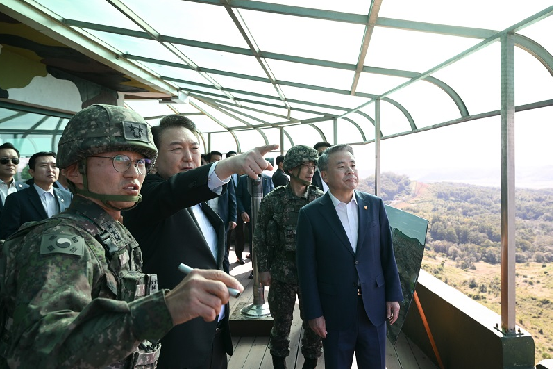 À±¼®¿ ´ëÅë·ÉÀÌ ±¹±ºÀÇ ³¯ÀÎ 1ÀÏ °æ±âµµ ¿¬Ãµ±º À°±º Á¦25»ç´Ü »ó½ÂÀü¸Á´ë¸¦ ã¾Æ Á÷Á¢ µµº¸·Î GOP öå ¼øÂû·Î¸¦ ¼ø½ÃÇÏ¸ç °æ°èż¼¸¦ Á¡°ËÇϰí ÀÖ´Ù.(»çÁø=´ëÅë·É½Ç)
