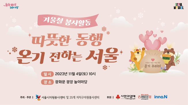 ¼¿ï½ÃÀÚ¿øºÀ»ç¼¾ÅÍ(¼¾ÅÍÀå ¼ÛÃ¢ÈÆ)´Â 11¿ù 4ÀÏ(Åä) ¼¿ï ±¤È¹® ±¤Àå ³îÀ̸¶´ç¿¡¼ ÀÚ¿øºÀ»çÄ·ÇÁ, ¹Ù·ÎºÀ»ç´Ü, ºÏÇÑÀÌÅ»ÁÖ¹ÎÀÚ¿øºÀ»ç´Ü, ¼¿ïµ¿Çà ´ëÇлý û³â µî ¼¿ï½Ã¹Î 350¿© ¸í°ú ÇÔ²² ¡®°Ü¿ï³ª±â ¿Â±â ²Ù·¯¹Ì Æ÷Àå Ȱµ¿¡¯¿¡ ³ª¼±´Ù.