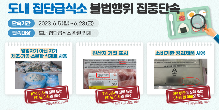 °æ±âµµ°¡ 6¿ù 5ÀϺÎÅÍ 23ÀϱîÁö ¿©¸§Ã¶ ½ÄÁßµ¶ ¿¹¹æÀ» À§ÇØ Áý´Ü±Þ½Ä¼ÒÀÇ À§»ý°ü¸® ½ÇÅÂ¿Í ¿ø»êÁö °ÅÁþ Ç¥½Ã, ¼Òºñ±âÇÑ °æ°úÁ¦Ç° »ç¿ë µî ºÒ¹ýÇàÀ§¸¦ ÁýÁß ´Ü¼ÓÇÑ´Ù.