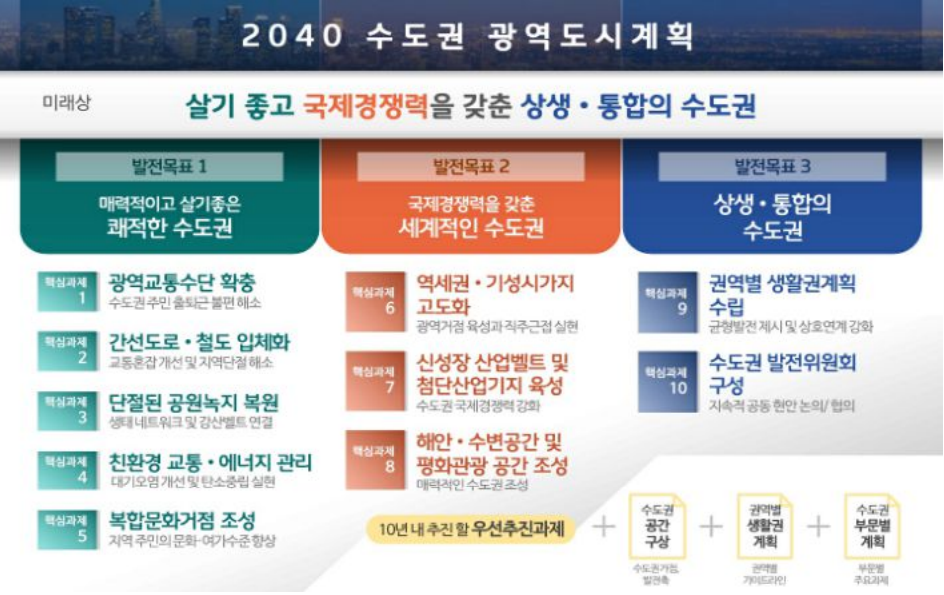 ¡¸2040 ¼öµµ±Ç ±¤¿ªµµ½Ã°èȹ¡¹ÀÇ ¹Ì·¡»óÀº ¡°»ì±â ÁÁ°í ±¹Á¦°æÀï ·ÂÀ» °®Ãá »ó»ý¡¤ÅëÇÕÀÇ ¼öµµ±Ç¡±À¸·Î, °èȹ¾È¿¡´Â À̸¦ ½ÇÇöÇϱâ À§ÇÑ 3´ë ¹ßÀü¸ñÇ¥¿Í 10´ë ÇٽɰúÁ¦°¡ ´ã°å´Ù.