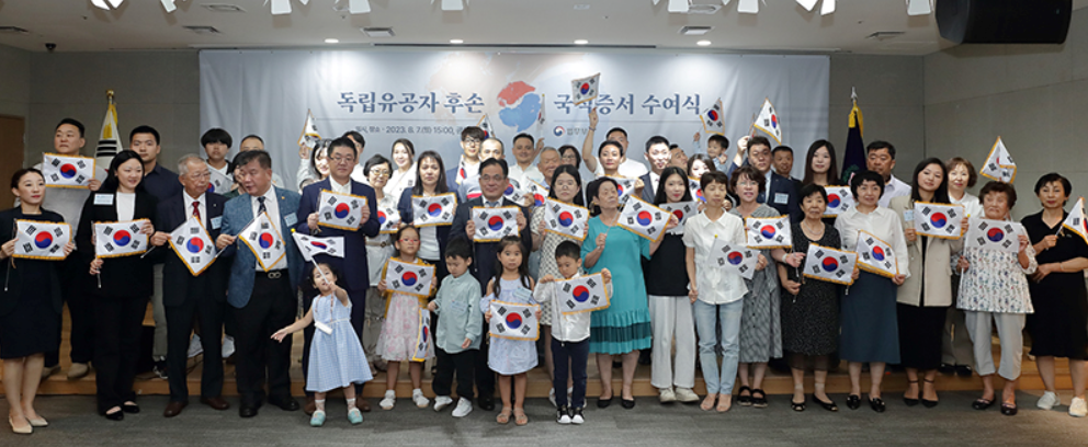 Á¤ºÎ°¡ µ¶¸³À¯°øÀÚÀÇ À§´ëÇÑ Èñ»ý°ú Çå½Å¿¡ º¸´äÇϱâ À§ÇØ µ¶¸³À¯°øÀÚ 13¸íÀÇ ÈÄ¼Õ 20¸í¿¡°Ô ´ëÇѹα¹ ±¹Àû Áõ¼¸¦ ¼ö¿©Çß´Ù.