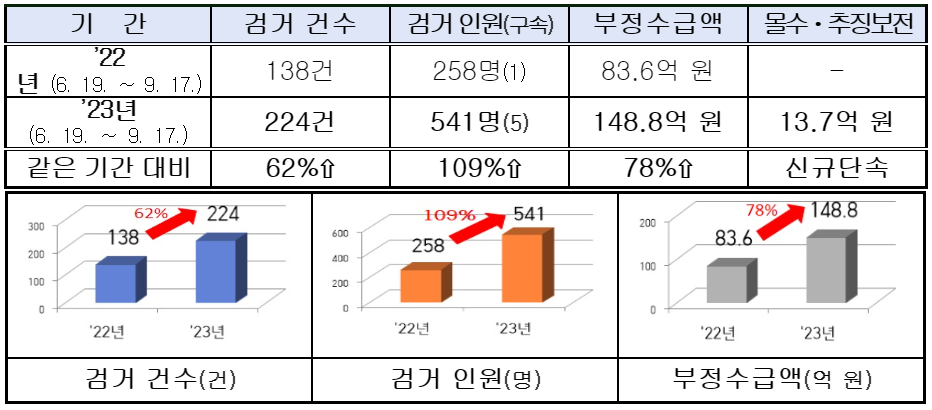 °æÂûû ±¹°¡¼ö»çº»ºÎ´Â ±¹°¡ÀçÁ¤ ´©¼ö¸¦ ¹æÁöÇÏ°í °æÁ¦Á¤ÀÇ ±¸ÇöÀ» À§ÇØ 6¿ùºÎÅÍ ±¹°íº¸Á¶±Ý ºÎÁ¤¼ö±Þ¿¡ ´ëÇÑ Àü±¹ Ưº°´Ü¼ÓÀ» ÃßÁøÇÑ °á°ú, 3°³¿ù°£(¡¯23. 6. 19.¢¦9. 17.) ÃÑ 224°Ç ‧ 541¸íÀ» °Ë°ÅÇϰí, ºÎÁ¤¼ö±Þ¾× ÃÑ 148.8¾ï ¿øÀ» Àû¹ßÇÏ¿´´Ù°í ¹àÇû´Ù.