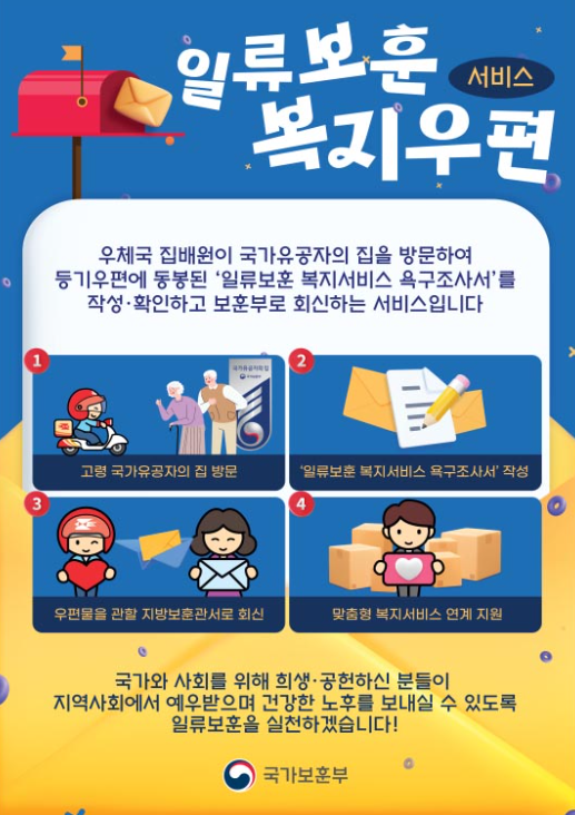 ¡®ÀÏ·ùº¸ÈÆ º¹Áö¿ìÆí¼ºñ½º¡¯´Â º¸Èƺο¡¼ ±¹°¡À¯°øÀÚ¿¡°Ô º¹Áö¼ºñ½º ¿å±¸Á¶»ç¼¸¦ ¹ß¼ÛÇϸé, Àü±¹ÀÇ ¿ìü±¹ Áý¹è¿øÀÌ ±¹°¡À¯°øÀÚ ÀÚÅÃÀ» ¹æ¹®ÇØ ±¹°¡À¯°øÀÚ °³°³Àο¡°Ô ÇÊ¿äÇÑ ¼ºñ½º¸¦ ÆÄ¾ÇÇÑ µÚ Á¶»ç¼¸¦ º¸ÈƺηΠȸ½ÅÇÏ´Â ¹æ½ÄÀ¸·Î ÀÌ·ïÁø´Ù.