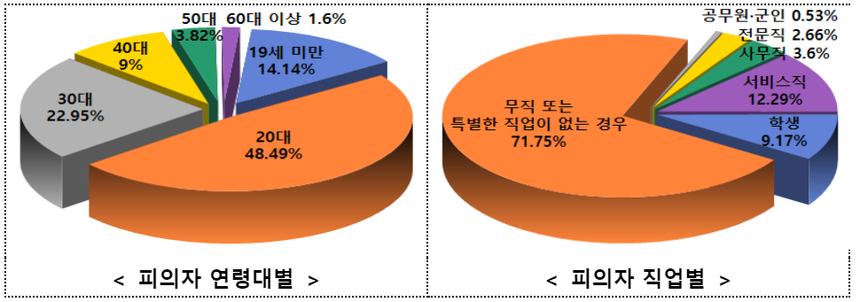 ÇÇÀÇÀÚ ¿¬·É´ë¸¦ ºÐ¼®Çϸé, 20´ë°¡ 48.49%·Î °¡Àå ¸¹¾Ò°í, 30´ë(22.95%), 19¼¼ ¹Ì¸¸(14.14%), 40´ë(9%), 50´ë(3.82%), 60´ë ÀÌ»ó(1.6%) ¼øÀ¸·Î ³ªÅ¸³µ´Ù.ÇÇÀÇÀÚ Á÷¾÷º°·Î ºÐ¼®Çϸé, ¹«Á÷ ¶Ç´Â Ưº°ÇÑ Á÷¾÷ÀÌ ¾ø´Â °æ¿ì°¡ 71.75%·Î °¡Àå ¸¹¾Ò°í, ¼ºñ½ºÁ÷(12.29%), Çлý(9.17%), »ç¹«Á÷(3.6%), Àü¹®Á÷(2.66%), °ø¹«¿ø ¡¤ ±ºÀÎ(0.53%) ¼øÀ¸·Î ³ªÅ¸³µ´Ù.»çÀ̹ö »ç±â ¡¤ ±ÝÀ¶¹üÁË¿¡¼ °¡Àå ÀÚÁÖ ¹ß»ýÇÑ ¹üÁË À¯ÇüÀÎ ¡®Á÷°Å·¡ »ç±â¡¯¿Í ¡®¸Þ½ÅÀú Çǽ̡¯Àº »ç¶÷µéÀÇ ¼ø°£ÀûÀÎ ÀÇ»ç°áÁ¤°úÁ¤¿¡¼ ³ªÅ¸³ª´Â ½É¸®Àû ¹ÝÀÀ Ư¼º¿¡ ±âÀÎÇß´Ù´Â °øÅëÁ¡ÀÌ ÀÖ´Ù.»çÀ̹ö »ç±â¹üÁË´Â ÃÖ±Ù¿¡µµ Áõ°¡ÇÏ´Â ¹üÁËÀÌÁö¸¸, ±× ¼ö¹ýµéÀº °ú°Å¿¡µµ Áö¼ÓÇØ¼ ¹ß»ýÇØ¿À´ø ¿ÀÇÁ¶óÀλó »ç±â ¼ö¹ý¿¡¼ À¯·¡ÇÑ °ÍÀÌ´Ù.