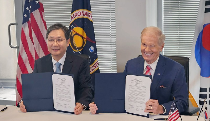 À±¿µºó ¿ìÁÖÇ×°øÃ» ûÀå(¿ÞÂÊ)°ú ºô ³Ú½¼ ¹Ì ¿ìÁÖÇ×°øÃ»(NASA) ûÀåÀÌ ÇöÁö½Ã°£ Áö³ 9¿ù 19ÀÏ ¹Ì±¹ ¿ö½ÌÅÏ D.C.¿¡ À§Ä¡ÇÑ NASA º»ºÎ¿¡¼ Çù¾à½ÄÀ» ü°áÇÏ°í ±â³äÃÔ¿µÀ» Çϰí ÀÖ´Ù.(»çÁø=¿ìÁÖÇ×°øÃ» Á¦°ø)