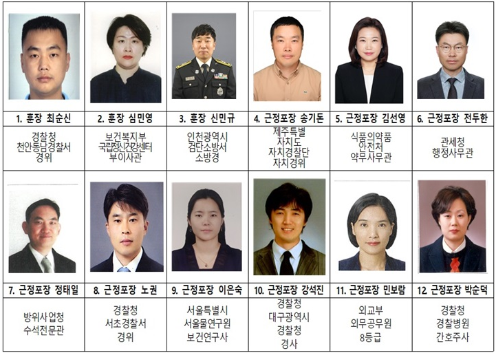 ÀÌ¾î¼ Àü·«¹°ÀÚ ºÒ¹ý ¼öÃâÀ» Àû¹ßÇÑ °ü¼¼ °ø¹«¿ø, Çѱ¹Çü ÀüÅõ±â(KF-21)ÀÇ ºñÇàÁ¦¾î ±â¼úÀ» °³¹ßÇÑ ¹æÀ§»ç¾÷û ¼ö¼®Àü¹®°ü, 1ÀÏ À̳» È®ÀÎÇÒ ¼ö ÀÖ´Â ½Å¼ÓÇÑ ¼öµ¾¹° ºÐ¼®¹ýÀ» °³¹ßÇÑ ¼¿ïƯº°½Ã º¸°Ç¿¬±¸»ç°¡ ±ÙÁ¤Æ÷ÀåÀ» ¼ö»óÇß´Ù.