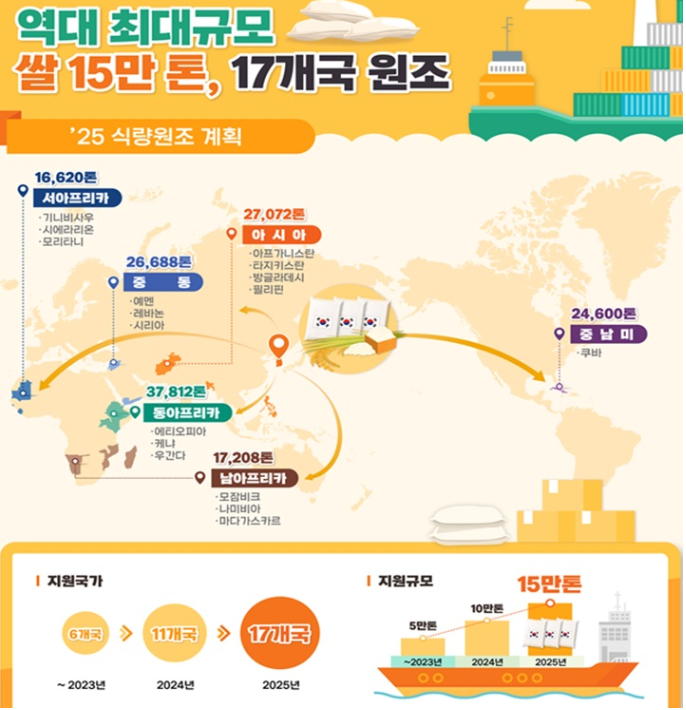 ³ó¸²Ãà»ê½ÄǰºÎ´Â ¿ÃÇØ À¯¿£ ¼¼°è½Ä·®°èȹ(WFP, World Food Programme)À» ÅëÇØ ¾ÆÇÁ¸®Ä«, ¾Æ½Ã¾Æ, Áßµ¿, Áß³²¹Ì µî 17°³±¹ÀÇ ³¹Î, °Á¦ ÀÌÁÖ¹Î, ¿µ¾ç°áÇÌ ¾Æµ¿ µî ¸ðµÎ 818¸¸ ¸í ´ë»óÀ¸·Î 15¸¸ ÅæÀÇ ½ÒÀ» Áö¿øÇÑ´Ù°í 18ÀÏ ¹àÇû´Ù.