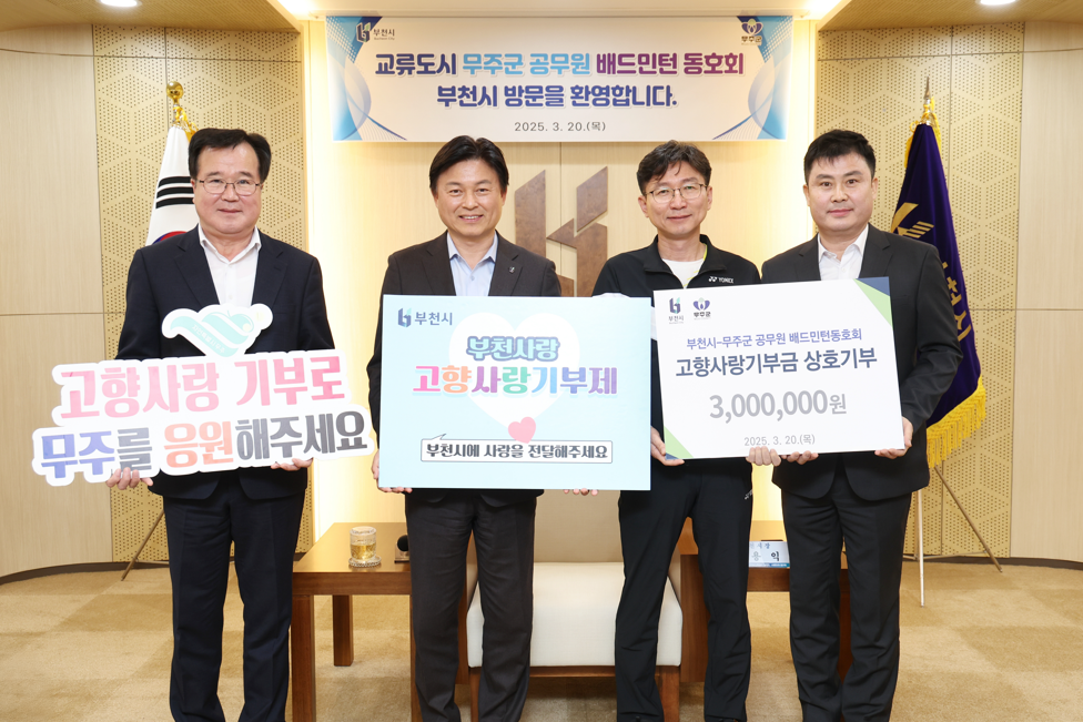 Á¶¿ëÀÍ ºÎõ½ÃÀåÀº ¹«ÁÖ±º ¹æ¹®´Ü°úÀÇ °£´ãȸ¿¡¼ µÎ µµ½ÃÀÇ »óÈ£¹ßÀüÀ» À§ÇÑ ±³·ù Ȱ¼ºÈ ¹æ¾ÈÀ» ³íÀÇÇßÀ¸¸ç, ÀÌ ÀÚ¸®¿¡¼ ºÎõ½Ãû°ú ¹«ÁÖ±ºÃ» ¹èµå¹ÎÅÏ µ¿È£È¸´Â °íÇâ»ç¶û±âºÎÁ¦¿¡ µ¿ÂüÇØ °íÇâ»ç¶û°ú ³ª´®À» ½ÇõÇß´Ù.
