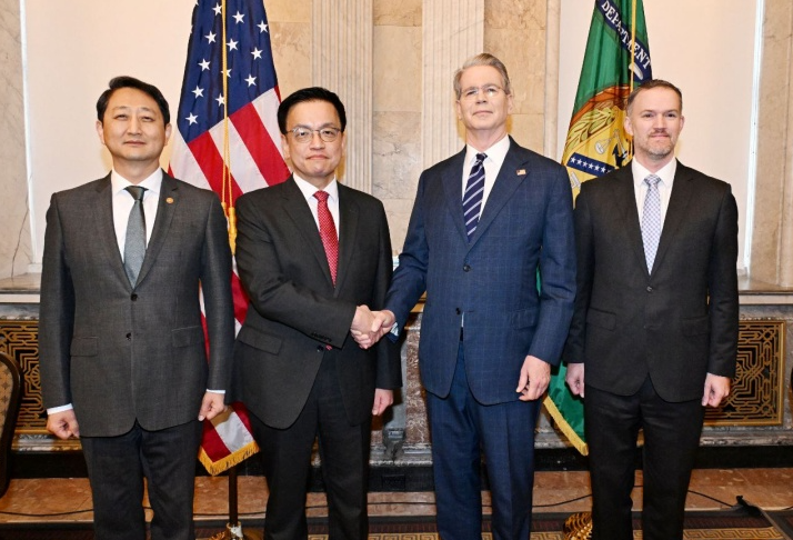 ÃÖ»ó¸ñ ºÎÃѸ®¿Í ¾È´ö±Ù »ê¾÷Åë»óÀÚ¿øºÎ Àå°üÀÌ 4¿ù 24ÀÏ ¹Ì±¹ À繫ºÎ¿¡¼ ¿¸° 'ÇÑ-¹Ì 2+2 Åë»óÇùÀÇ'¿¡ Âü¼®, ½ºÄà º£¼¾Æ® ¹Ì À繫Àå°ü°ú Á¦À̹̽¼ ±×¸®¾î ¹«¿ª´ëÇ¥ºÎ ´ëÇ¥¿Í ±â³ä»çÁøÀ» Âï°í ÀÖ´Ù. (»çÁø=±âȹÀçÁ¤ºÎ)